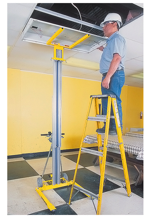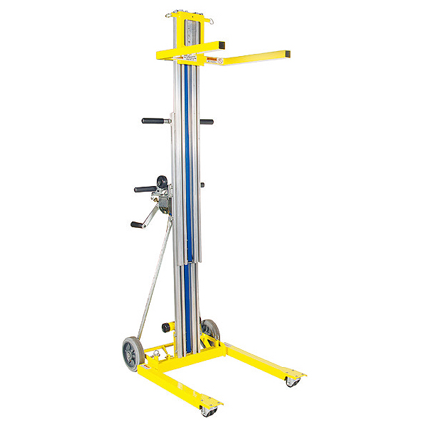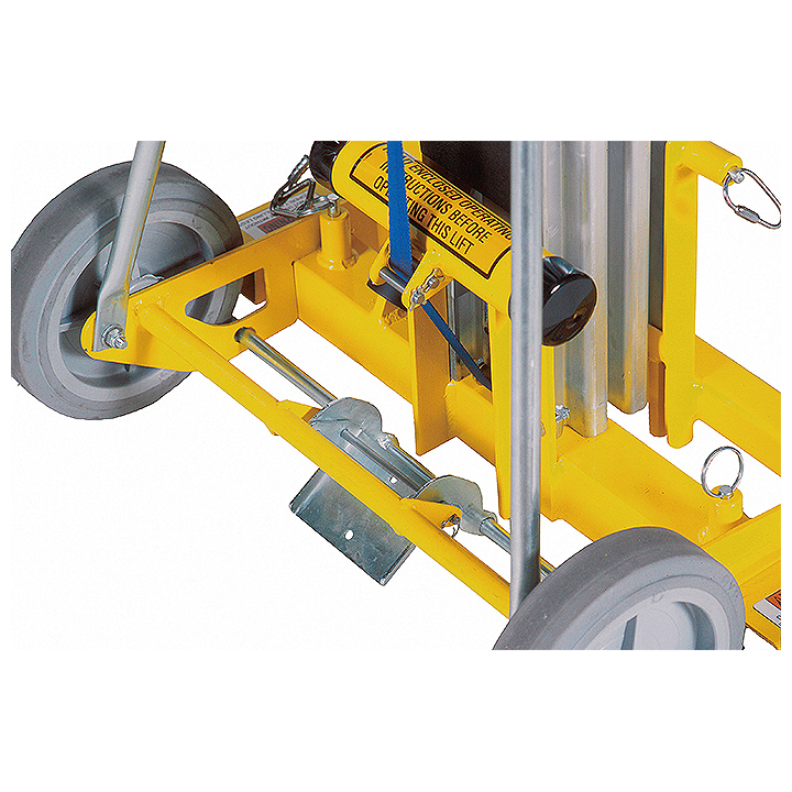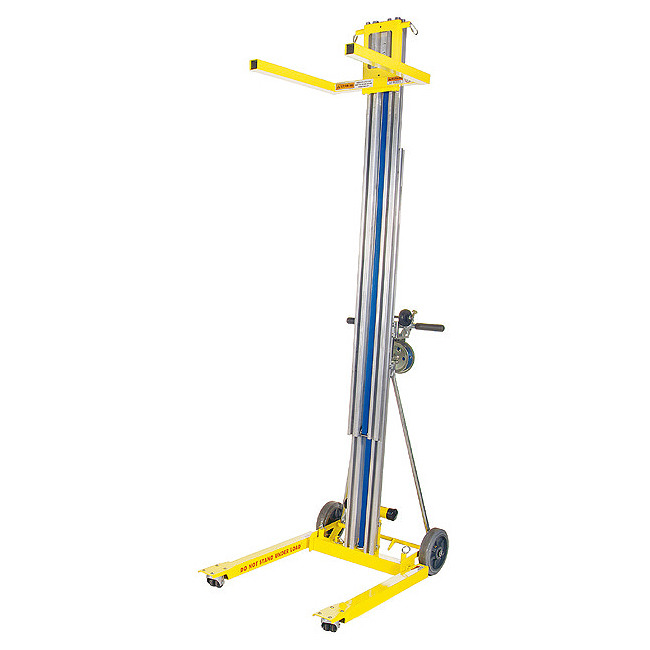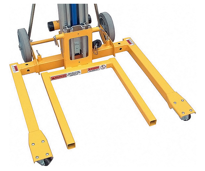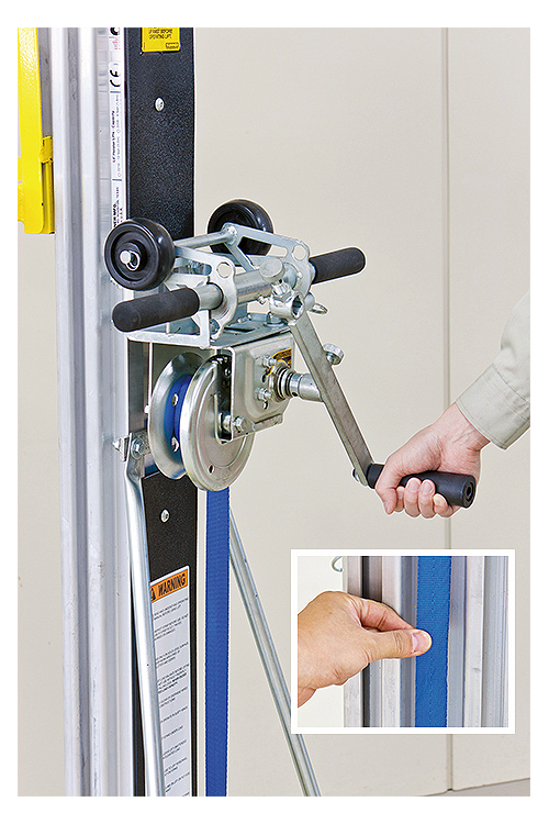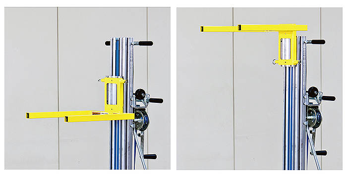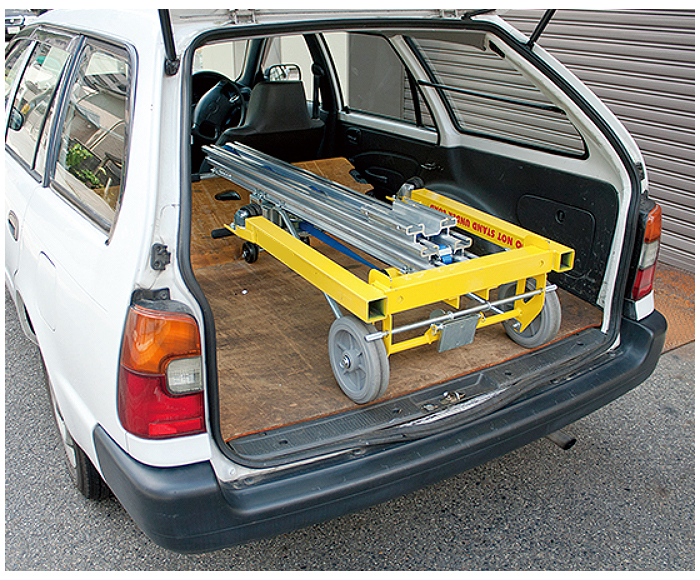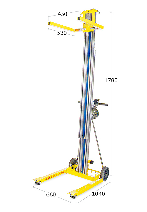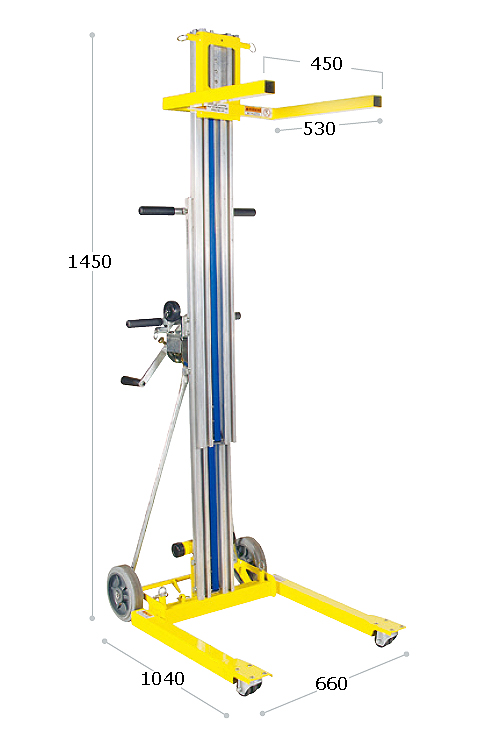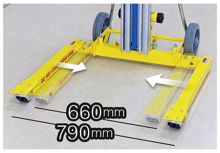 | ■特徴 ●収納時にフォークが取り外しできベースの足が折りたたみ可能なため、車への積み込みが可能。 ![]() ●動力不要の手動式 ベルトを巻上げて荷物をあげるため、電気、炭酸ガスなどの動力源が不要。 ベルト式だから、油も不要で交換もラク。 ![]() ●爪の上下反対取付け 爪の上下反対取付けができるため、作業に応じて天井開口部までピッタリ荷上げが可能。 ![]() ●脚部は2 段階で開脚可能。(660mmと790mm) アームが床位置まで下がるので、好みの位置で積み降ろしが可能。 ![]() ![]() ●送り速度を標準から高速へ(2速)上げ下げ可能。 ●移動がラクにできるように、折りたたみキャスター付き。 ●ベルトはナイロンストラップ使用。 ●ベルトのキンク(よじれ)がない。 ●コンパクトで軽く、しかも強いアルミマスト使用。 ■使用例 エアコン、室外機の取付け、車への商品の積み下ろし、ケーブルラックの持ち上げ、パイプとダクトの位置決め、蛍光灯等の照明機器の設置、壁掛けテレビの持ち上げ等 ![]() ![]() ![]() ■タイプ&寸法図