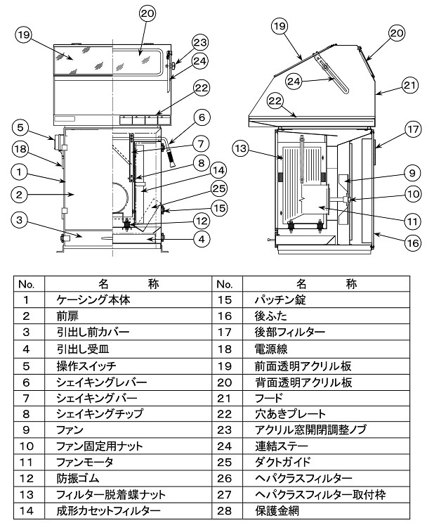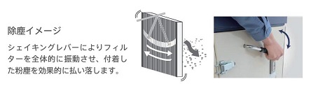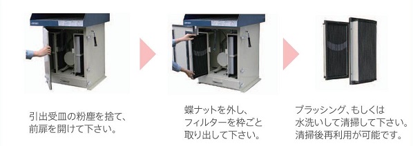 | 集塵機と作業台を一体にすることで圧力損失を少なくし、小さなモータでより効率の良い高い集塵能力を実現した装置です。 全機種でろ過面積が非常に大きいプリーツ形状の成型不織布フィルターを採用し、高い集塵効率を発揮します。 ![]() ■特長 ●高性能メインフィルター搭載 ろ過面積が非常に広く、目詰まりしにくいフィルターです。微細な粉じんに標準で対応可能です。 ![]() ●HEPAクラスフィルター取付 高い捕集効率で、よりクリーンな排気を実現します。排気の清浄度を上げ、クリーンな環境下での使用を可能にします ●可動式ダストバリアで様々な作業に対応 ダストバリアは左右・奥の3方向に独立し、作業に対し柔軟な対応が可能。フルフラットな作業面で長尺・大型ワークに対応 ![]() ●省エネモータで高い集塵能力 作業スペース直結型の為、通常の配管・フードを接続する一般的な集塵機と比べ、抵抗となる【圧力損失】がほとんどありません。小さなモータで最大限の集塵能力を実現します。 ●手動シェイキング装置 シェイキング機能で粉じん量の多い作業にも対応。払い落した粉塵は下部受皿に溜まり、そこから回収が可能。定期的な払い落しでフィルター寿命の延長に繋がります。 ![]() ●レイアウト変更が簡単 配管やフードが無い為、レイアウト変更時に無駄な時間とコストを削減できます。電源接続のみで設置可能です。 ●24 時間連続運転が可能 フィルターメンテナンスやシェイキングに伴う停止は必要ですが、長時間の連続運転が可能です。 ●工具レスで簡単メンテナンス フィルターメンテナンス・交換に工具は全く必要ありません。どなたでも簡単にメンテナンス可能です。 ●再利用可能なフィルター 汚れてしまったメインフィルターは、水洗い or ブラッシングで清掃した後、再利用が可能で経済的です ![]() ●幅広い用途に対応 単に集塵だけでなく、除塵、除電後の粉塵の再付着予防にも最適です。 ![]() ■各部名称 ![]() ■寸法図(mm) ![]() ■共通仕様