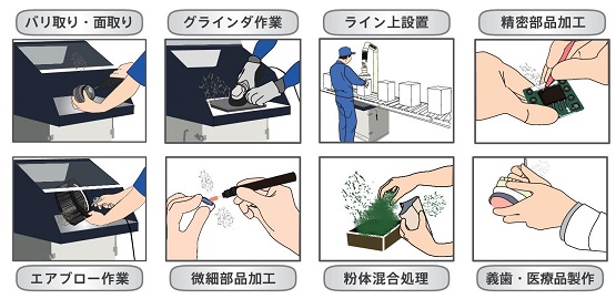 ■その他オプション ●エアシャワー機能 集塵機を通過し、浄化された排気エアを再利用し、作業台面へ送り込みます。プッシュプル効果により集塵能力が向上します。 ※シャワーノズルは伸縮・折曲を自由自在に行うことができます。 ![]() |