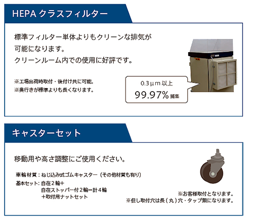 ■オプション ●キャスターセット M513ES75Y-CASTER-SET 移動用や高さ調整に使用できるねじ込み式ゴムキャスターセットです。 ※お客様取付となります。 ※但し取付穴は長(丸) 穴・タップ無になります。 ●HEPAクラスフィルター M513ES75Y-HEPAFILTER 標準フィルター単体よりもクリーンな排気が可能になります。 ※工場出荷時取付・後付け(後蓋交換)共に可能。 ※奥行きが標準よりも長くなります。
