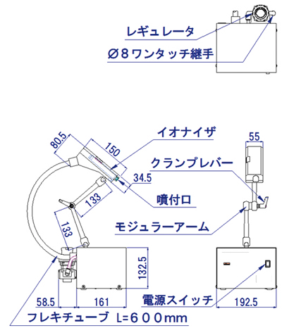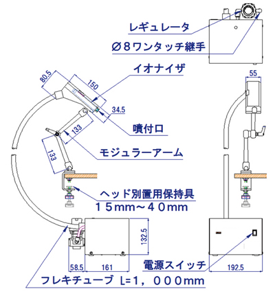 ■特徴 ●両手作業がラクラク ●ワークを近づけるだけでイオンブローを噴付 ●自由な位置決め(360°どこでも可能) ●小型イオナイザ採用 ●ホコリ対策 ■寸法図