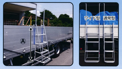 | ■特長 ●荷台への乗り降りが安全にできます。 ●トラック荷台のアオリに引っ掛けるだけで簡単に設置できます。 ●横でも後ろでも又アオリを下げても使用できます。 ●メーカー独自のアルミ材により、とても軽く取扱いが楽にできます。 ●耐久性に優れ、とても長持ちします。 ●手摺付で安全です。 ![]() ■仕様