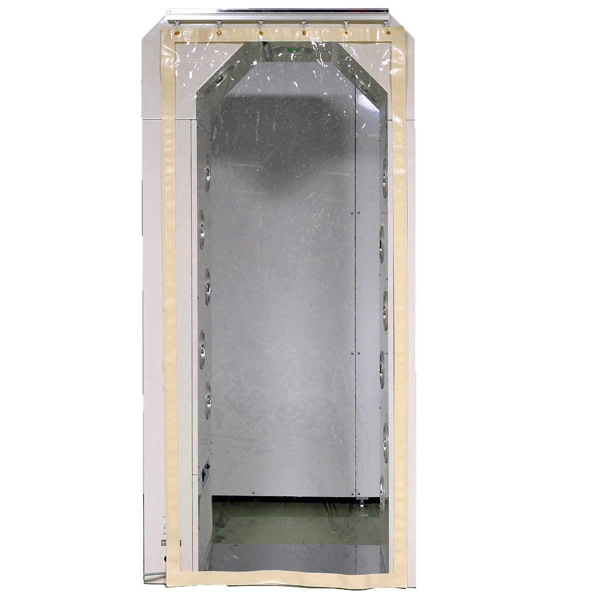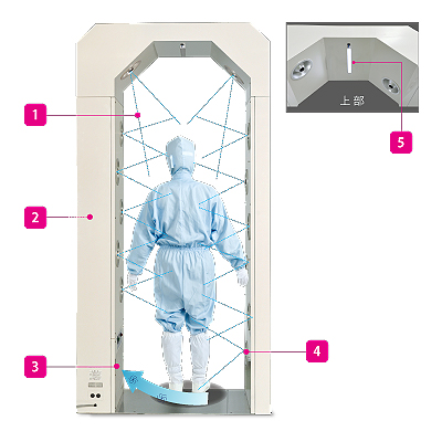 クリーンルーム、クリーンブースなどの出入口に設置し、 高速で吹き出したクリーンエアにより、人体、衣服に付着した埃、毛髪、糸くず、花粉などを吹き飛ばし、除去することを目的とした装置です。