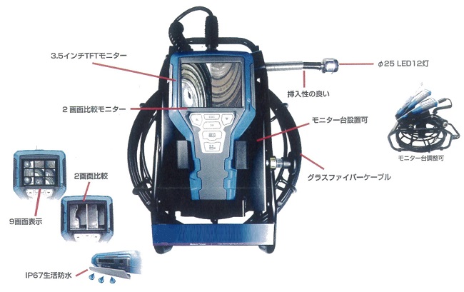 ■特長 ●先端径:φ25mm 高輝度LED 12灯つき ●硬性グラスファイバーケーブル標準20m(最長 70m) ●据置ドラムでケーブル引出し&巻取りが簡単(キャリーケース付) ●ハンドヘルド 3.5 インチ LCD モニター付き ●防塵/防水:IP67等級 ●40mm以上の配管内部の観察点検に最適です ![]() ■外寸図 ![]() ■仕様
