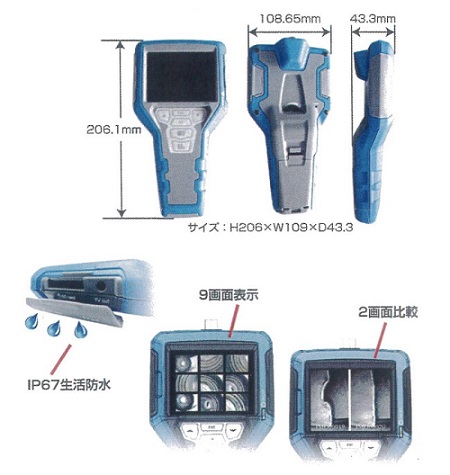 ■特長 ●先端径:極細φ3.9mm~φ10mm ●高輝度LED 4灯つき(調光可) ●どんなに狭い暗い場所でも目が届きます ●ストレート型のケーブル部は最長30mまで製作可能 ●スタイリッシュ&オリジナルカラー3.5 インチ LCD モニター ●ボタンひとつで動画・静止画を記録(4G・SDカード付) ●最新機能搭載: 2Xデジタルズーム、映像左右反転、 9画像一括呼出し&2画像比較、リチウムイオン電池内蔵 ■外寸図 ![]() ■共通仕様