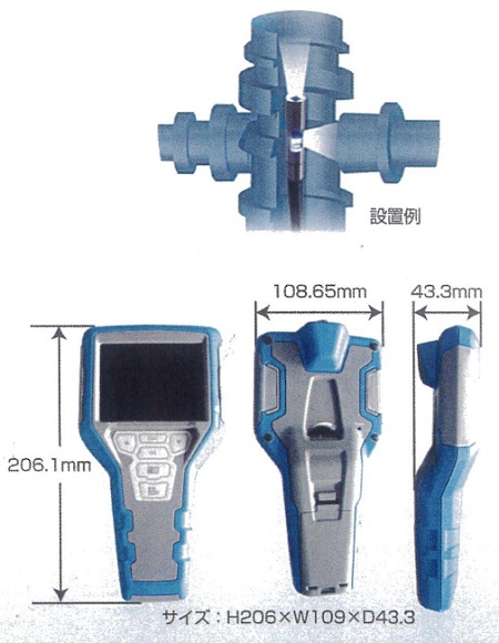 ■特長 ●極細5.8mmケーブルの先端に2種のカメラを搭載 ●手元スイッチ切り替えで直視と側視(90°)観察が可能です ●リアルタイムでのモニター映像は、静止画でも動画でも内蔵SDカードへ保存 ●LED照明付きですので、どんなに狭く暗い、目の届かない場所での観察に最適です。 ![]() ■外寸図 ![]() ■仕様