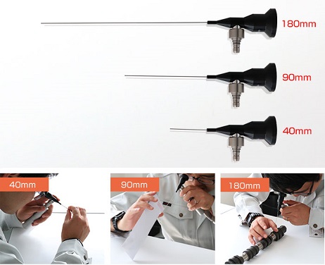 | ■特長 ●直接見えない場所を非破壊で検査 先端部0.83mmの極細径なので、今まで直接見ることができなかった内部や隙間・穴など様々な場所を非破壊検査することができます。 ![]() ●用途によって選べる3タイプの長さ 40mm/90mm/180mmから対象物に応じて最適なサイズを選べます。 最短で40mmの短いサイズなら、小さい部品や金型も見やすく、点検時に対象物と目の距離が近いため、身体や目への負担が少なく疲れの軽減に繋がります。また、長いサイズなら、工ンジンや機器の奥の方や、顔を近づけにくい対象物の場合に便利です。 ![]() ●使用用途 ・金型のバリ検査 ・鋳物の巣の検査 ・構造物やコンクリートの劣化や剥離の検査 ・税関や警察などで、破壊できないものに対してのセキュリティ検査 ・FA生産ラインで行う加工や組立時の検品 ・小口径パイプ内部の検査 ・精密部品の検査 など ![]() ●約90°の広い視野角で広範囲を点検 一般的に1mm以下の直径では視野角が50°前後のものが多いですが、このスコープは0.83の直径で視野角が約90°と他製品に比べて見える範囲が広い分、点検の際にかかる時間を短縮でき、また長時間覗き込むことによる目の負担を軽減します。 ![]() ●先端部にステンレスを採用 このスコープの先端部にはステンレスを採用しているので壊れる心配を軽減でき、更に、ステンレス素材は軽量なのでずっと持ち続けても疲れません。 ※極細径なので無理に負荷をかけると破損する恐れがあります。 ![]() ■対応製品を組み合わせて性能アップ 狭い穴などを観察する際、暗いので光源が必要です。光源はお手持ちのもので本製品対応であれば購入する必要なく使えます。 また、大勢での観察など、モニタに映し出して観察したい場合には別売りのWifi接続Cマウントカメラと光源(別売)、Cマウントアダプタ(別売)を組み合わせれば、ワイヤレスでモニタに映し出すことができます。 見ている映像を静止画や動画として残すことができ、資料作成や情報共有に役立ちます。 ![]() ●目視のみの場合 目視がしたい場合は本製品に光源(別売)を組み合わせるとお使いいただけます。 ![]() ●モニタに映し出して撮影する場合 モニタに映し出し、撮影したい場合は本製品に光源(別売)、Wifi接続Cマウントカメラ(別売)、Cマウントアダプタ(別売)を組み合わせるとお使いいただけます。 ![]() ■仕様
