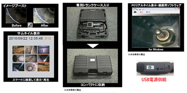 | ■特長 ●VGA (640×480 pixel)の高解像度 ●コントロールボックスに3つの機能ボタン 1、イメージブースト機能ボタンで、先端LED照明の光で不十分な場合にワンボタンで感度アップ 2、画像表示回転機能ボタンで、画像を90°ずつ回転 3、パーティクルフリー機能ボタンで、サイドミラー表面に付着したダストによる光の乱反射をキャンセル ●M987VP-2KA専用PCリアルタイム表示・録画用ソフトウェアCD標準付属 ●USB電源供給機能付 ※USB電源アダプターは付属してません(USBケーブル標準付属) ●SDメモリーカードに静止画や動画を記録可能 ●録画データのサムネイル表示機能 ●機能付きカメラケーブルとの使用でVGA高画質 ![]() ![]() ■仕様