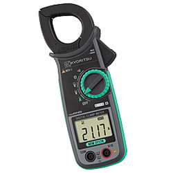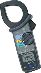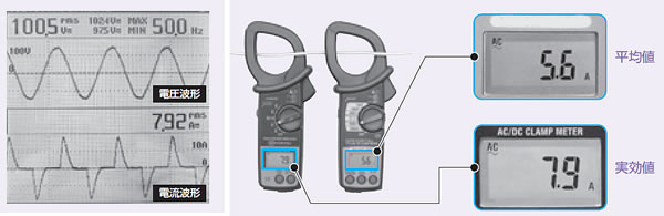 | ■概要 クランプメータは配線をクランプする(はさみこむ)ことにより、回路を切断することなく、通電状態のままで電流を測定することができる非常に便利な測定器です。一般のマルチメーターの場合は敗戦を切断して電流測定回路をつなぐ必要がありますが、クランプメーターは敗戦をクランプするだけで電流を測定することができ、回路への影響も少なく、大電流も簡単に測定することができます。 ■真の実効値測定(二乗演算回路=RMS)について ●ゆがんだ波形でも正確に測定 サイリスタおよびインバータ制御等の省エネルギー設備により高調波成分を含む歪んだ電流波形の測定をした場合、平均値形測定器は真の実効値形測定器と比べ測定値に誤差が生じることがあります。歪みが多い回路には実効値形測定器をご使用ください。(商用周波数:正弦波(50/60Hz)に歪みが生じていなければ、実効値タイプ平均値タイプ共に同じ測定値を指示します) RMSタイプの測定器は、瞬時瞬時の波形を内部演算していますので、歪んだ波形の真の実効値測定が可能です。ある波形の瞬時値の二乗を1周期間で平均した値の平方根を実効値といいます。 ![]() ※上記はサイリスタ制御のモータ負荷を測定したものです。真の実効値タイプの測定器は7.9Aを指示するのに対して、平均値タイプは5.6Aを指示します。 ■タイプ