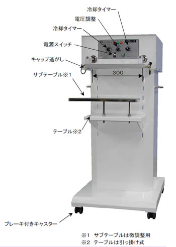 | ■特長 ●キャップ付きスタンドパックが立てた状態でシールできます。 ●フットスイッチを軽く踏むだけでシールできます ●スタンドパック用にシール機工には強力電磁石、強力トランスを使用していますので確実なシールができます。 ■仕様