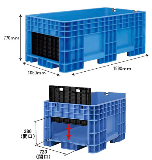 片短辺に大型開口部(723×386mm)をもつコンテナです。 | 大型樹脂製投入口付コンテナタンク 品番 MC31K1000B-BLS 価格 ¥313,000 |