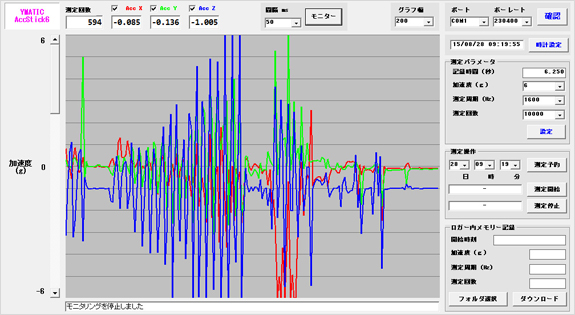 | ■特長 加速度士2Gから士400Gまで、サンプリングスピード0.05Hzから1600Hzまで、記録ポイント50万ポイント、記録時間最大3000時間の今までにない加速度ロガーです。 軽量・小型の為、測定値に影響を与えません。今まで測定が困難であったタイヤ内部や小動物への設置など、限られたスペ スでの測定が可能になります。 ●超小型・軽量 15mm×32mmの超小型・軽量で設置が容易。 ●幅広い測定レンジ 2G/ 4G/ 6G/8G/16G/ 100G/200G/ 400Gの選択が可能。 ●高速サンプリング 0.05Hz~1.6kHzまでの選択が可能。 ●大容量メモリ搭載 最大50万ポイントの測定が可能。100Hzで約80min。 ●充電式電池 電池は内蔵式でケーブルを挿すだけで充電完了。 ●時間トリガー機能 日にち、時間、分の予約設定が可能。 ■アプリケーション画面 ![]() ■用途例 ![]() ■仕様