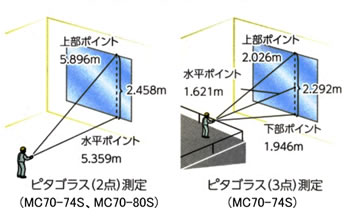 | ■特長 ●間柱の長さ、筋交いの長さ、幅木や廻り緑の長さなど大工作業時の測定に便利な尺相当表示機能付です。 ●部屋の面積や容積を測ることができます。 ●ピタゴラス測定で離れた位置の高さが測れます。 ![]() ●測定した数値を自動的に記憶します。(MC70-74S) ●測定した数値同士を加算、減算することができます。(MC70-74S) ●設定した距離毎に音で知らせる等間隔通知機能付です。(MC70-74S) ●カメラのセルフタイマーのように、設定時間になると測定するタイマーモード付です。一人作業で机などの長さを測る時に便利です。(MC70-74S) ■用途 ●建築現場や改装工事など様々な距離の測定に。 ■タイプ