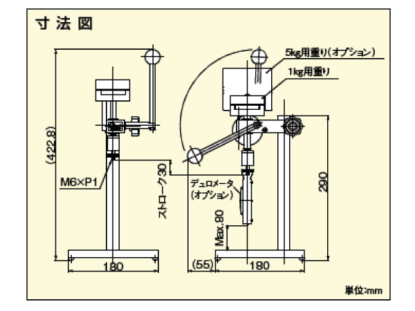 | ■硬さ測定用手動スタンド(スピードコントローラー付) MD15S-612T ●下降速度調整ユニットは信頼性の高いスピードコントローラを採用しました。 ●デュロメータの押針(測定子)と試料との高い密着性を実現したアライメントユニットを搭載しました。 ●測定可能範囲はアナログ65mm、デジタル40mmを確保。 ●ホルダーの落下防止と上下微動が簡単にできる角ネジナット付きシャフトを採用。 ●タイプA、タイプEデュロメータなどはそのまま1㎏測定ができます。タイプDでの測定はオプションの5Kg測定用重りMD15Y-046Tが必要です。デジタルデュロメータ(MD15SD-**Tシリーズ)はオプションの1㎏用測定重りMD15Y-090Tが必要です。 ●ISO/JISに規定されている質量の校正証明書(デュロメータ付き)の発行が可能です。 ■硬さ測定用手動スタンド MD15S-615T ●デュロメータを取り付け、手動によりJISなどに規定されている荷重でゴムの硬さ測定が行えます。 ●カム式を採用し、使い易さとコストパフォーマンスを実現。 ●デュロメータの押針(測定子)と試料との高い密着性を実現したアライメントユニットを搭載しました。 ●タイプA、タイプEデュロメータなどはそのまま1㎏測定ができます。タイプDでの測定はオプションの5Kg測定用重りMD15Y-046Tが必要です。デジタルデュロメータ(MD15SD-**Tシリーズ)はオプションの1㎏用測定重りMD15Y-079Tが必要です。 ●校正書類の発行ができます。(操作速度の証明はできません。) ■寸法図 ●MD15S-612T ![]() ●MD15S-615T ![]() ■仕様