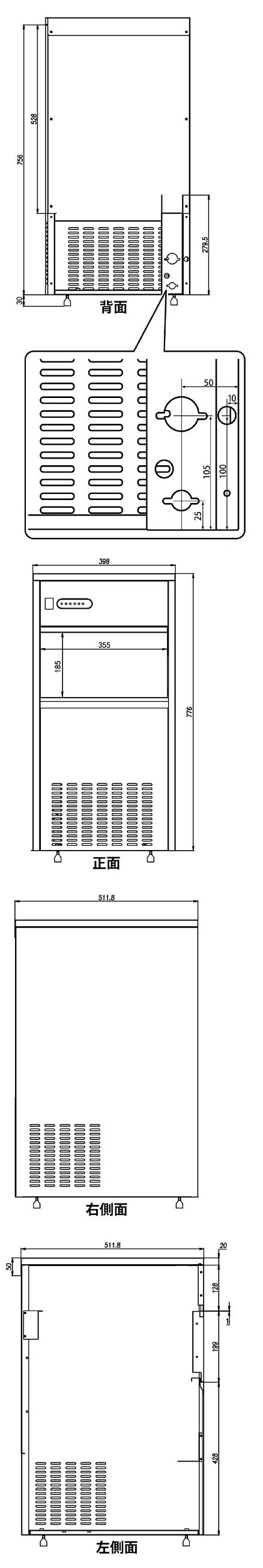 | ■特長 ●取り出し口の扉はスライドしながら上部に収納。 ●保健室などで、アイシング用や、夏場の熱中症対策に。 ●氷嚢にも入れやすい異形氷。 ●置きやすくちょうどいい25Kgタイプ。 ●サビや腐食に強いステンレスボディ。 ※飲食用としてのご利用はできません。 ※業務用(一般家庭でのご使用はできません。) ※給水・排水工事が必要です。 ■寸法図 ![]() ![]() ■仕様