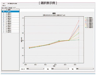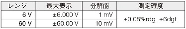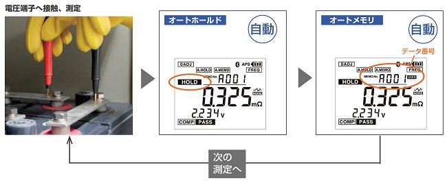 | ■特長 ●耐ノイズ性向上:ノイズ重畳時の比較 ![]() ●リードを端子に接触させるだけ:らくらくデータ保存 スイッチ操作をしなくても、測定値が安定したら自動的に保存できます。 リードを端子に接触させてからオートメモリによる保存まで最速 約2 秒、メーカー従来機種(MF12H-3554)と比較して60%短縮 しました。 ・オートホールド 測定値が安定すると自動で測定値をHOLD します。 ・オートメモリ オートホールド後、自動でホールドされた測定値を内部メモリへ保存します。 ![]() ●読み込んだデータを転送、現場から報告:現場でレポート作成 MF12T-3554H-01からタブレット・スマートフォン・PC に読み込んだ測定データは、帳票形式での閲覧のほかグラフ化して1 キュービクル分(最大500 個)の状況把握ができます。さらに、現場にいながら瞬時にレポート作成が可能です。 ![]() ●過去からのデータをトレンド表示:解析(トレンド表示はPC アプリのみの機能) グラフ化して1 キュービクル分(最大500 個)のトレンドや、選択したバッテリの表示が可能。 ![]() ■確度仕様(確度保証期間 1年、調整後確度保証期間 1年) 確度保証温湿度範囲:23℃±5℃、80% rh以下、ウォームアップ時間:なし(不要) ■抵抗測定確度 測定電流周波数:1 kHz±30 Hz、ノイズ周波数回避機能有効時は1 kHz±80 Hz 測定電流確度:±10% ![]() ※ゼロアジャスト未実施の場合、次の値を加算 MF12LE-9465H-10 使用時:±5 dgt. MF12LE-2020H 使用時:±6 dgt. MF12LE-9772H 使用時:±1 dgt. MF12LE-9460H 使用時:±16 dgt. MF12LE-9467H 使用時:±5 dgt. 上記以外のテストリードや延長したリードを使用する場合はゼロアジャスト実施後のみ確度保証 ■電圧測定確度 ![]() ■温度測定確度 ![]() ■コンパレータ機能 設定値(抵抗:2レベル、電圧:1レベル)と測定値との比較判定 判定方法:次表の結果表示、ブザー音、ブザー音に連動して赤色バックライト点灯 設定保存:200 テーブル ![]() ■仕様