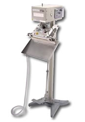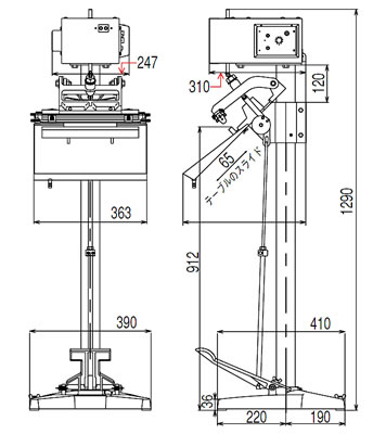 | ■特徴 ●水物シールに適した構造 特殊耐食性合金、ステンレス製部品、特殊塗装部品を使用し、電気肺尖部を水のかかりにくい上部に配置した水物専用機として優れた性能を発揮します。 シール開口部は床面方向に傾斜しており、袋内の液体内容物を袋からこぼすことなくシールすることができます。漬物、惣菜、液体調味料、レトルト食品などのシールに最適です。また、排水溝付のステンレス製テーブルを標準装備しています。テーブルの奥行調整ができます。 ●簡単操作 タイマーで加熱時間を包材の種類・厚みなどに合わせて調整します。袋をシール部にセットし、ペダルを踏むとシールができます。 ![]() ●バリエーション 片側加熱タイプ(上部ヒーター仕様)は厚さ0.3mm(重ね合わせ合計数値)までの包材をシールできます。 上下加熱タイプは厚さ0.4mm(重ね合わせ合計数値)までの厚手袋、ラミネート袋に対応できます。 ●安全装備 万一、ヒーター過熱(約4秒経過しても加熱が終了しない)が発生した場合、自動的に電源スイッチがオフ状態になり、加熱を停止します。 ●製品名称の末尾が10WKの製品は組紐ヒーターを採用しています。 組紐ヒーターは、ニッケルクロム(NiCr)の細線を組紐状に編んで作った、大きな段差も吸収する柔軟性の高さが特徴であるヒータです。 従来のリボンヒーターと比較して段差の大きな袋(ガゼット袋など)でもヒーターの縁の形状が丸い特性から”エッジ切れ”の無い、丈夫なシールを行うことが可能で、繰り返しても傷がつきにくい構造をもち、耐久性の高いヒーターで厚手フィルムやラミネート袋、ガゼット袋のシールに対応します。 ■寸法 ![]() ■仕様
