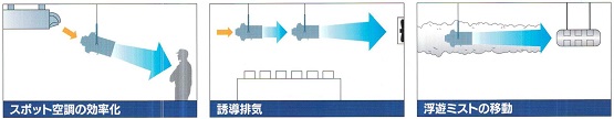 | ■特長 ●今まであきらめていた場所でも設置可能。 ●35Wの電力で、風速1mの風を16m先まで送れます。 ●最大52dBという低騒音設計。 ●三相200V、単相100V仕様をラインナップ。 ●配線工事が簡単に出来ます。 ●落下防止対策対応。 ■用途 ●冷暖房設備の吹出口手前に本機を設置することで生産ラインの人へのスポット空調を支援します。 ●製造工程から発熱する熱・蒸気は本機の直列配置により換気扇まで順送にて移動させることで効果的な換気ができます。 ●工場内に浮遊しているオイルミストも本機を設置することで集中型ミストコレクタ等に向けて移動させることができます。特に窓を開けられない冬季には効果的です。 ![]() ■寸法図(MF34W-211HF) ![]() ■仕様