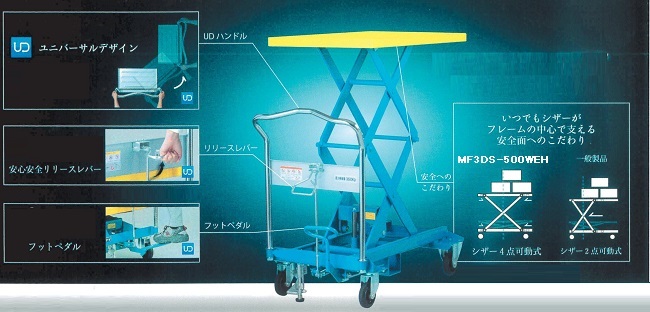 小さくても重量物対応の高揚程リフトです | エルゴノミック高揚程油圧台車リフト 品番 MF3DS-500WEH 価格は下記をご覧下さい |