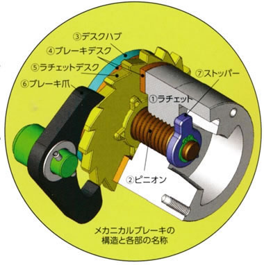 | ■概要 ●可能な限りステンレス鋼を使用した本格的ステンレスウインチ、 本体ケーシング、ドラム、ギヤカバー・ハンド部に、ハイグレードなSUS304を使用、 軸受け部にもステンレス製ボールベアリング、ネジやボルト類もステンレス製を使用し防錆に重視した設計。 ●ギヤやメカニカルブレーキ等の内部機構は強度上ステンレス以外の材料を使用しています。 (ラチェットは青銅鋳物CAC408) ●ブレーキカバー・ハンドル握りは耐候性プラスチックを使用。 ●塗装仕上げ。 ■安全性を追求 ●ワイヤロープの安全係数を3.55倍以上に設定(クレーン構造規格第54条) ●ドラムを大径化してD/d=11以上を確保 ●セーフティプランジャの採用によりハンドルの固定、長さ調整が簡単で確実、ハンドルの脱落も防止 ●信頼性の高い実績のある安全なブレーキ機構群 ![]() ■環境に配慮 ●ブレーキデスクは非アスベストのアラミド繊維製、メッキは三価クロメート処理、 塗装も鉛を含有しない塗料を使用して、RoHS対応済 ■信頼のメカニカルブレーキ ●メカニカルブレーキの構造 ラチェット①はピニオン②にねじ込まれていて(右ねじ)、ハンドルが取り付けられます。 ピニオン②は減速ギヤ(100型は減速なし)を介してドラムにつながっています。 デスクハブ③は四角穴でピニオン②に一体となって組み込まれています。 ブレーキデスク④は、ラチェットデスク⑤の段付部の上を自由に回転します。 ラチェットデスク⑤はブレーキ爪⑥によって左回転は阻止され、右回転しかできません。 ![]() ●荷重の巻き上げ ハンドルを右回転させるとラチェットがピニオンにねじ込まれるので、 ラチェットとデスクハブに挟まれたブレーキデスク、 ラチェットデスクを押し付けて一体となりピニオンと共に右回転します。 減速ギヤ(100型は減速なし)を介して繋がるドラムが回転してロープを巻き取って荷重を巻き上げます。 ハンドルの右回転を止めると、荷重によりピニオンが左回転しようとしますが、 一体化したラチェットデスクがブレーキ爪によって左回転を阻止されているので 自動的にブレーキがかかることになります。 ●荷重の巻き下げ ピニオンは荷重によって左回転しようとしていますが、 一体化したラチェットデスクがブレーキ爪に左回転を阻止されてブレーキがかかっています。 ここでハンドルを左回転させるとラチェットのねじがゆるんでブレーキデスクを押さえつける力が弱まり、 ラチェットデスクの一体化もゆるむことによって左回転ができないラチェットデスクを残して ピニオンがハンドルを回した分だけ左回転します。 減速ギヤ(100型は減速なし)を介してつながるドラムが回転してロープを巻き戻して荷重を巻き下げます。 ハンドルの左回転を止めると、荷重によりピニオンがラチェットにねじ込まれて ブレーキデスクを押さえる力が高まりラチェットデスクが一体化してブレーキが自動的にかかります。 ●ハンドル操作 ハンドルを右回転させれば巻上げ、左回転させれば巻下げができます。 またハンドルの回転を止めればその位置で自動的にブレーキがかかり、荷重の宙吊りが容易に出来ます。 ![]() ●オプションの軽荷重ブレーキ(PAT.P) メカニカルブレーキの構造上常にピニオンに左回転させる荷重が掛かっていないとブレーキが掛かりません。 またウインチの最大荷重に対して実際の荷重が非常に軽い場合(15%以下)や 荷重変化があるとブレーキが掛かり難くなり、スベリを起こすことがあります。 軽い荷重でも安定した制動が出来る様に開発されたのが軽荷重ブレーキ(オプション)です。 垂れ幕・バトンの上下・蓋の開閉・跳上げ橋・ベルトコンベアーの仰角調整等に安心してご使用戴けます。 注意: ・ブレーキ機構の改造が必要なので後付は出来ません。新規御用命時の指示をお願いします・ ・逆巻き厳禁 ハンドルを左回転してもワイヤをドラムに巻付けでき荷重を巻上げることができますが、 メカニカルブレーキの構造上ブレーキが全く利いていませんので、ハンドルから手を離すと荷重が落下し、 ハンドルが急に逆回転して非常に危険です。 ハンドルの巻き上げ方向には十分注意してください。 ・ハンドルの左回転が巻上げ、右回転が巻下げのいわゆる逆巻き仕様も、 別途メカニカルブレーキ部の改造で対応可能ですが、誤操作の可能性が高くなるので良くご検討下さい。 ![]() ■安全なハンドル押工 ハンドルは容易にセーフティプランジャで長さ調整の3カ所の穴にしっかり固定することが出来ます。 ハンドルの脱落も心配ありません。 注意:・ハンドル3カ所の穴以外での固定は出来ません。(100NF型は2カ所穴) ![]() ■簡単なワイヤの取付 ワイヤはドラムの通し穴に先端を差し込み横から止めネジで押さえる簡単確実な方法を採用 注意:・余巻(捨巻)は3巻き以上必要です。 ![]() ■タイプ・寸法図