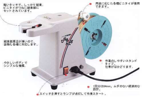 | 結束機レンタル承ります。 レンタルできます、結束機の数量にはかぎりがございます。まずメールにてお問い合わせください。 レンタルの開始前に下記金額を先にお振込みいただくこととなります。 ・予定レンタル料 ・運賃 ・保証金10万円(後でご返却いたします) 上記お振込み確認後ご出荷となりますが、出荷までに3日ほどかかります。 手持ちレンタル機械の数量には限りがございますので、必ずレンタルできるとは、限りません。よろしくお願いいたします。最低レンタル日数3日以上からとなります。 ■特長 オートタイプ(電動式) 安全性と使いやすさを考えた、 低コスト設計の結束オートマシン。 農作物をはじめ、食品関連の袋物・その他 製品の包装に最適。 ●プラスチック芯入りの画期的な新ビニタイ。 金属探知機への対応万全。 食品業界待望の新結束材。 ■仕様