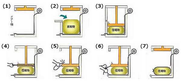 | ■特長 圧縮減容梱包機とは、工場や倉庫などで発生するかさばる廃棄物等を扱い易くするために圧縮減容する機械です。かさばる廃棄物は、保管スペースをムダにしたり、運搬に大変手間がかかります。 それを減容することにより、保管スペースや運搬回数を減少させ、廃棄処理コストの削減、およびCO2排出を減らし環境問題に貢献いたします。 ●小さくても納得のパワー ●投入口が低くて入れやすい ●投入容量が大きいので、一度に沢山の廃棄物が投入可能 ●頑丈で耐久性に優れる ●ガイドシリンダによって、油圧シリンダへの負担が少なく、安定した圧縮ができます。 ■こんな所でお役に立ちます。 製造課、食品工場、ホームセンター、流通・運輸サービス、デパート・スーパー、自治体 ■導入によるメリット ●廃棄物保管スペースが少なくなります。 ●運搬の手間と回数が省け、CO2削減効果があります。 ●廃棄物処理コストが削減できます。 ■圧縮可能物 ペットボトル、食品トレー、ビニール袋・プラスチック袋、ダンボール ■従来のプレスキーでは300mmまでしか下がらなかったプレス板が、ローラーでは150mmまで下がります。 ![]() ■プレスキー工程