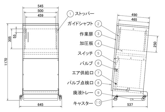 | ■特徴 廃缶18L缶またはペール缶を入れて蓋を閉めると、圧縮が始まります。処理が終わったら、蓋を開けて出来上がり。こぼれた廃液は本体の背中(内側)を流れ、後ろに置いたトレーがキャッチしてくれます。 ■ご注意 ●ストッパーが天板についていますので、廃缶はストッパー分の厚さになります。 ●もっと薄くしたい場合は、2枚から3枚重ねて再度圧縮してください。 ●コンプレッサー、ホース等は別途お求めください。2馬力以上のコンプレッサーをお勧めします。 ■仕様