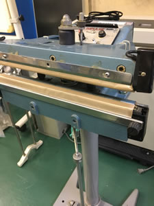 ●袋をシール部にセットします。タイマーで加熱時間を包材の種類・厚みなどに合わせて調整します。あとはペダルを踏むだけでシールができます。