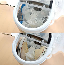 手を汚さず濡らさず靴を入れるだけ。 ブラシが仕込まれた靴専用の超小型の洗濯機です。 ブラシ取り外し可。 普通のミニ洗濯機としても使える。 |