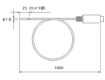 ■主な特長 ●内視鏡直径1.8mm ●広角レンズを搭載、わずかな隙間から内部を広範囲に観察可能 ●カラーCMOSイメージングセンサ16万画素 ●高輝度白色LEDを使用、マニュアルで調光可能 ●カメラチューブ長さ1m(2mまで延長可) ■寸法図(単位mm) ![]() ■仕様