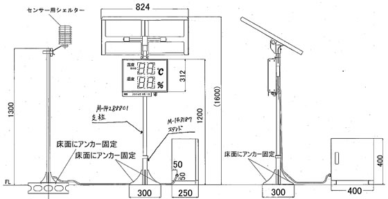 既存の温度・湿度表示板にソーラーシステムを付けた屋外用の温度・湿度表示計です。 移動式(キャスター付き)はこちら |
