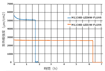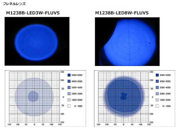 | ■特長 ●リチウムイオンバッテリーを充電池にしたコードレスライトです。 コードが付いた物と比較にならない機動性を発揮できます。 充電するときは本体ごとでも、バッテリー単体でも充電器にセットできます。 バッテリーは3.5時間で満充電になります。満充電での使用時間は約2時間です。 リチウムイオンバッテリーなので途中追加充電をしてもメモリー効果などによる容量不足が発生しません。 充電回数はおおむね500から700回程度です。バッテリー単体での購入もできます。 ●フレネルレンズ ライト部に紫外線透過樹脂のフレネルレンズを使用しており、UVLEDから発する紫外線を効率よく集光しています。 おおよそ75%程度均一な照射面ができます。(LEDがある中心部は若干強い紫外線強度があります) 400ミリ離れたところで、トプコン社製の紫外線強度計計測で約5000μW/cm2の紫外線強度で直径220ミリの範囲に照射できています。 ●M1238B-LED8W-FLUVSは、より出力の強い紫外線LED採用。M1238B-LED3W-FLUVSと比べて中心で2倍程度の紫外線強度が得られます。 ![]() ●連続点灯時間 約2時間連続して照射することができます。 光源がLEDなので、スイッチを入れるとすぐ点灯します。またスイッチを切ってもすぐに再点灯が可能です。 従来品は電源を入れてから安定した紫外線を出すまでに数分を必要とし、また一度スイッチを切ってしまうとライト部が冷えるまで再点灯ができませんでした。これに対し本器は使いたいときにすぐ使える紫外線ライトです。 ![]() ●ヒートシンク どの方向で使用しても、効率よく放熱できます。 ●ハンドランプとして 作業用だけでなく、検査・点検などにも。 ●投光器として 置いて使用することにより、両手が自由に使えます。 ●照明部は最大90°回転することができるので、照らしたい方向へピンポイントで向けられます。 ●防塵・防滴の保護等級はIP54。水のかかるような場所でも使用できます。 ![]() ■用途 ![]() ●車のクーラーサイクルのレアリークチェック用紫外線光源 ●エンジンブロックのオイル漏れチェック用紫外線光源 ●紫外線硬化パテ・紫外線硬化塗料・紫外線硬化樹脂の硬化促進用光源 ●病院・宿泊施設などの有機汚れ目視チェック用光源 ●繊維ホコリの目視検査用光源 ■仕様