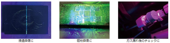 紫外線探傷剤によるキズのチェックや、漏れのチェックに。 小型で取り扱いがラク。 コードレスタイプなので、電源の届かない場所や外出先、大型の機械や車体等も容易に点検。 |