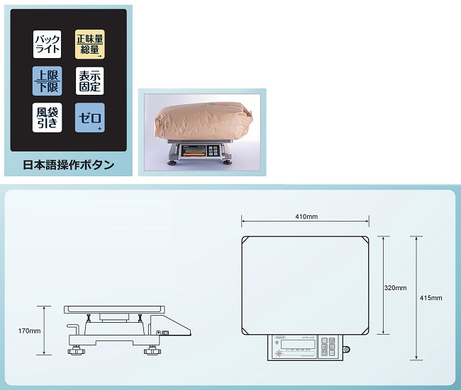 ■特長 ●秤量 30kg/60kg/120kg ●持ち運びに便利な平面一体型、使い勝手のよい横長台座 ●わかりやすい日本語ボタン ●内蔵バッテリーで長時間駆動 ■搭載機能 ● ゼロ点調節機能(ゼロ) ● 風袋引き機能(風袋引) ● 表示値固定機能(表示固定) ● 上下限値チェッカー機能(上限/下限) ● 正味重量/総重量切替表示機能(正味量/総量) ● バックライトON/OFF切替(バックライト) ![]() ■仕様