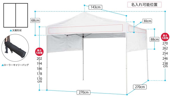 ※日除け用簡易テントの為、常設や雨天のご使用はおやめ下さい。 ※オプションとして、風対策用のウエイトがございます。 ※垂幕部に名入れが可能です(詳細はメールまたはFAXにてお問合せ下さい)。 |