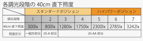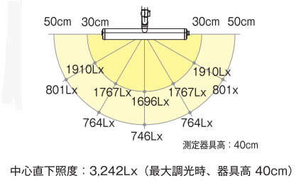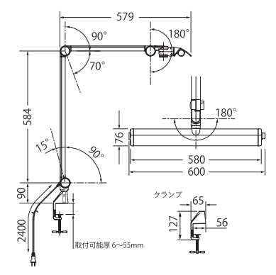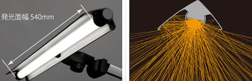 | ■特長 ●余分な反射を軽減する専用設計のシェード 広く照らせる専用設計のシェード形状。 対象物からの光の反射を軽減しながら対象物をくまなく照らします。 ※ランプ交換式ではありません。 ![]() ●広範囲をムラなく、明るく 最大直下照度3,243Lx(40㎝)の明るさ。 広範囲をムラなく、広く照らします。 新設計の反射板により見やすい光を実現します。 ![]() ●ロータリースイッチによる7段階調光 わかりやすい数字の調光表示で、最適な照度が選びやすくなりました。 ![]() ![]() ●手袋の上からでも操作可能な大型ジョイントノブ 耐油性に配慮した樹脂を採用しています。 ![]() ●3方向に180°可動するネックジョイント ネックジョイントは3軸それぞれに180°回転可能です。 ![]() ●堅牢なロングアームで作業状態を保持 バネが内蔵のため、スプリングの隙間に付着する埃や異物の落下が防げます。 垂直モードで高位置からも照射可能(光源高さ机上より約130cm) ![]() ●付属クランプ抜け止め付 ![]() ●AC100Vコンセント入力 ACアダプタが不要なコンセント入力。 コード長さ約2.4m ![]() ■机上面照度分布イメージ ![]() ■水平面照度 ![]() ■外形寸法図 ![]() ■仕様