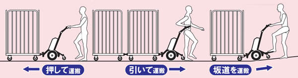 | ■特長 ●小型・軽量 車両に搭載しやすく保管場所もとらない ●速度調節 高速・低速モード選択&無段階速度調節 ●バッテリー 連続走行6時間&一目で分かる充電残量 ●空転防止 重さで前輪が空転するのを防ぐ「後輪」付き ![]() ■後ろの台車を引きながら運搬しやすいスタートレバー付き ![]() ■連結台車にも対応! ![]() ■仕様
