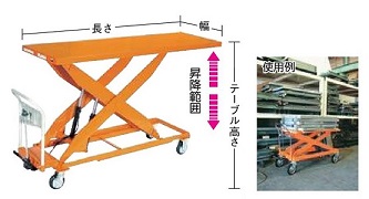 | ■特長 ●無負荷・軽負荷時に上昇させる作業が多い場所。 ●自在ストッパー付キャスター、固定キャスター各2個付 ![]() ■用途 長尺物・大物の運搬・昇降や作業台として。 ■仕様 ●早送り装置なし