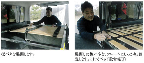 ■組立手順 ![]() ![]() ■仕様 ●ウッドスプリング(板バネ)仕様 ●付属品:汎用取付キット、エアーマット2枚(使用時1,980×630×100/収納時φ220×700・グリーン)