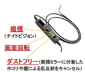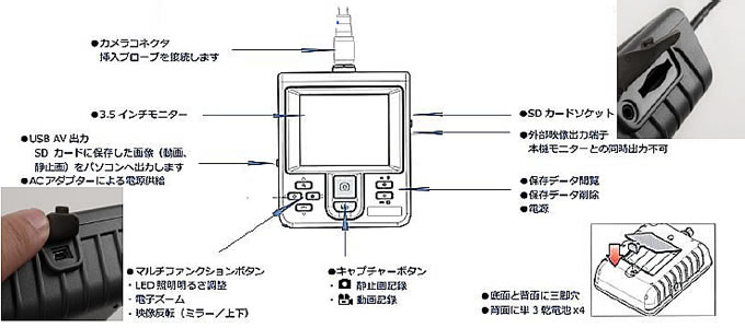 ●SD カードに動画と静止画を記録 ●小型モニターと乾電池/AC 駆動(外部電源) ●暗視 ・ 画面回転 ・ ダストフリーと多機能で悪環境でも鮮明画像 ●左右それぞれ155度曲げられることで、ほぼ死角なし |