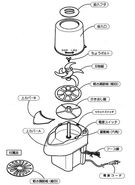 | ■使い方 ●スイッチを「ON」(刃物が回転します)にして、4cm角程度にカットした野菜を投入します。この時一度に大量に入れず、少しずつ入れて頂いた方が能率よく出来ます。 ●粗さは刃物の下にある粗さ調節板の交換で調節が可能です。更に細かくされたいときは再度投入して下さい。(2度通し) ※危険ですので投入口の中に手・指などは絶対に入れないで下さい。 ■仕様