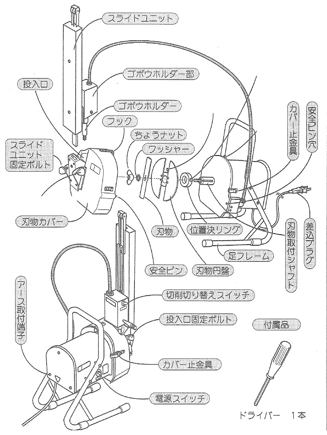 卓上小型ゴボウの自動ササガキ機。 面倒なゴボウのササガキ作りが簡単に。 斜め切りもO.K。角度・厚さ調節付き。 |