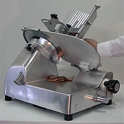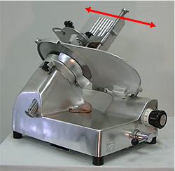 ②機械のスイッチを入れると丸刃がまわり、食品ガイドの往復運動でカットしていきます。