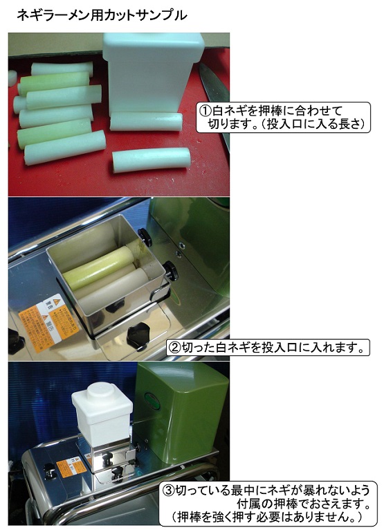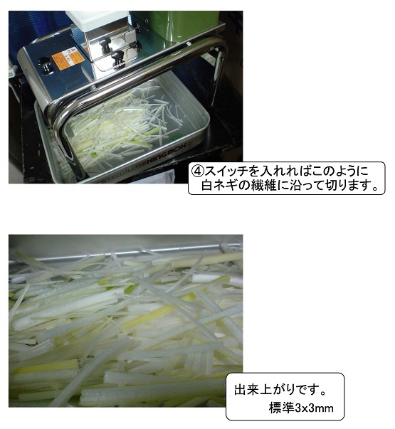 | ■使い方 ●野菜を7~8cmに切り投入口に並べます。 ●付属の押棒で軽く押えながらスイッチを「ON」にして頂くだけで、スライド部にセットしてある平刃・クシ刃の往復運動で真直ぐに綺麗な千切りが出来ます。 ■本機を使用すれば、ネギラーメン用のネギも切れます。 ![]() ![]() ■仕様
