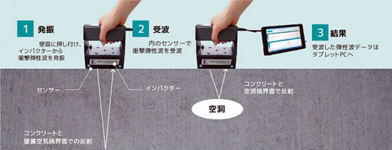 電磁波レーダでは測定することができない深い壁厚(測定深度:8cm~1.8m)が測定できます。 操作性も従来の衝撃弾性波機器に比べ大幅に簡単になりました。 左図はタブレット付きのM2598TG-3TKです。 |