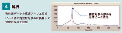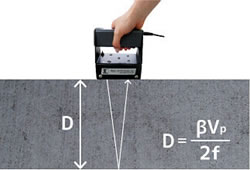| ■特長 ●測定深度:8cm~1.8m 厚さが60cmを超える場合は、内蔵のインパクターでは出力が足りません。 ハンマーで打音する必要があります。 使用するハンマーは、コンクリート厚がさが60cm~90cmの場合は0.5kg、90cmを超えるような厚い構造物の場合は1.5kgを用いてください。 ●インパクターとセンサーが一体化したコンパクト設計 ●測定から報告書作成まで一人で完結、ハイコストパフォーマンス ●コンクリート厚さから内部空洞探査まで。ジャンカ・空洞・クラック探査も可能です。 ●操作習得時間はわずか10分 ●測定精度は2%(キャリブレーション実施時)と高精度 測定誤差:測定誤差は部材中の音速によって生じます。 初期設定値は12,000ft/sec(3,675m/sec)となっており、この状態での測定誤差は約10%です。 既知の構造厚を使って音速校正を行うことにより、約2%まで精度を向上させることができます。 ●ASTM C1383-4に準拠 ●測定点数:初期設定時にグリッドを設定することにより、連続測定が可能になります。 テキストファイル(コンマ区切り)に水平位置(X)・垂直位置(Y)・周波数・厚さ(Z)の数値を出力可能です ●グリッド設定:1時間で約100点の測定が可能 ■測定手順 1.準備/グリッド(測定点図)の設定 縦横の測定点数から、タブレット上にグリッドを設定します。 2.測定 測定面に押し当て、グリップのインジケーターが緑になったら、トリガーボタンを押してインパクターから衝撃弾性波を発振します。 本体内のセンサーで受波した信号は、タブレットに送られます。 3.解析 タブレットに送られたデータは、周波数解析され、D=βV/2fの式からコンクリート厚さDを求めます。 (β=形状定数(0.8(柱)~0.96(床壁))、V=音速(初期設定音速:3,657m/秒)、f=ピーク周波数) ![]() ![]() ■衝撃弾性波法の測定原理 衝撃弾性波法は、弾性波がコンクリート部材の厚さ方向に多重反射することによって生成される定在波の基本周波数(第一共振周波数)を元に(1)式にしたがって部材の厚さDを推定する方法です。 D=βVp/2f…(図1) (Vp:音速、f:測定周波数、β:ベータファクター) 図1)コンクリート厚さ計測定法概要(右上:受信波形、右下:周波数解析結果) ![]() ■ジャンカ・空洞・クラックの探査 ジャンカでは、その状態によって健全部よりも深く測定される場合(ジャンカ内を突き抜けて壁で反射する場合)と浅く測定される場合(ジャンカで反射する場合)があります。 水平に広がる空洞・クラックでは、その表面で反射するために、健全部より浅く測定されます。 ![]() ■測定の際の配慮事項 ●平な部材表面 本体のセンサーおよびインパクターを適切に作動させるためには、平らな部材表面でご利用ください。 ●ハンマーを使った測定 測定方法は、ハンドルのライトがグリーンに点灯後、ハンドル裏のトリガーボタンの替わりに、本体に近い場所を上記ハンマーで打音してください。 ●角柱、円柱上の厚さの測定 (図1)のベータファクターは、部材の形状による幾何学的因子で、壁や床では0.96、角柱や円柱状のものではその断面形状に起因する複数の共鳴を持つため0.8となります。 よって柱状のものでは、実際音速が小さくなりますので、初期設定値12,000fpsのままで測定した場合、実際よりもの深く表現されます。 ●高強度コンクリートの場合 音速校正をせずに36N/mm2以上の高強度コンクリートで測定をする場合は、音速を13,000fpsに設定してください。 ●側壁からの影響 部材の大きさ(縦、横)が部材厚さの約6倍より小さい場合は、側壁からの反射の影響を受けるため、第一共振周波数の判別が困難な場合があります。 ●予想躯体厚(Expected Concrete Thickness) 初期設定では、設定画面の最下段にある「予想躯体厚」が6inch(15cm)となっています。 それ以上の厚さを測定する場合は、必ずこの値を変更してください。 初期設定の状態では4-8inch(10-20cm)の測定が可能です。 ■仕様