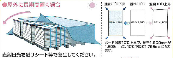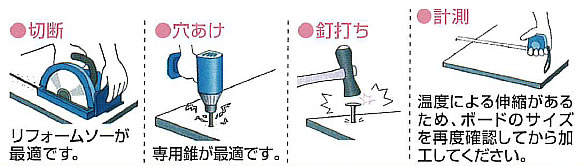 ※ボードの温度10℃上昇で、長手1,800mmが1,802mmに、10℃下降で1,798mmになります。 施工や加工の際は熱伸縮を考慮してサイズを再度確認してから行ってください。 ※切断も可能です。(リフォームソーなどが最適です。) ※穴あけ・釘うちが可能です。 ■基本性能