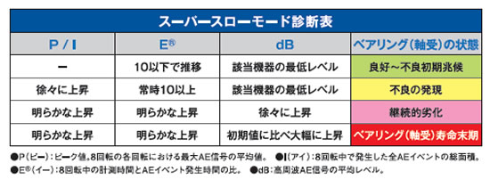 | ■M2647Gが選ばれている3つの理由。 工場やプラントには、さまざまな回転機器があります。 1rpm以下の低速機もあれば、50,000rpmを超える高速機もあります。 そんな工場やプラントで、選ばれているのが、「AEセンサ搭載ベアリング診断器M2647G」。 その理由は、3つ。 1台で、超低速機を含む「広範」な回転機器に対応できること。 初期段階での微細なトラブルも「早期」発見できること。 そして、専門的な知識も必要なく、どなたでも「簡単」に操作・診断判定ができることです。 ■特長 ●低速から高速まで、プラント内のさまざまな回転機器に1台で対応できます。 AEセンサ搭載のベアリング診断器は、「スタンダードモード(対象回転数:35~70,000rpm)」、「スーパースローモード(対象回転数:0.25~60rpm)」の2つの診断モードを採用。 モーター、ポンプ、ファン、ギアボックスなど、低速から高速まで、プラント内のさまざまな回転機器のベアリング(軸受)診断が、1台で対応できます。 ![]() ●「振動診断」では検知困難な微細なトラブルも「早期発見」できます。 M2647Gは、AE技術(Acoustic Emissionアコースティック・エミッション)による、高感度AEセンサを採用。 ベアリング(軸受)の状態劣化によって生じる摩擦・衝撃・圧壊など、微小な破壊も精度よく捕捉が可能です。 例えば、下図のような「潤滑不良」が発生した場合、一般的な「振動診断器」では、摩擦エネルギーが微小であるため、不良として検知することは困難です。 一方、高周波信号が取得可能なAEセンサを採用したM2647Gでは、転動体が潤滑不良個所を通過する際の「微小なエネルギー」も捕捉可能。 不良箇所の早期検知で、確実な予知保全が可能です。 ![]() ●「統一パラメータ」の採用で、どなたでも迷わずベアリング(軸受)診断ができます AEセンサ搭載ベアリング診断器M2647Gは、診断時には独自のパラメータ「ディストレス(R)」と「dB(デシベル)」、2つの数値を同時に表示。 「ディストレス(R)」は、初期不良の有無の判定値をどの機器にも適用可能(10以下=良好/10以上=初期不良)。 機器ごとに判定値を設定する必要はありません。 ベアリング(軸受)の軸径・型式などの入力が不要で、管理値の事前計算の手間もありません。 また、同時表示の「dB」は、初期不良が出たベアリング(軸受)の使用限界を判断するうえで有効です。 もちろん、操作も簡単。センサを設置し、計測ボタンを押すだけ。 約10秒程※で、計測値が表示されます。 ※スタンダードモードの場合。 ![]() ■スーパースローモードを採用。60rpm以下の超低速回転にもしっかり対応。 M2647G-16214-KHTとM2647G-16114-KHTには、振動診断器では不良検知が困難な「0.25~60rpm」の超低速回転機のベアリング(軸受)診断に有効な「スーパースローモード」を採用。 操作は簡単。計測する機器の「一回転に要する秒数」を入力するだけ。 「P・I・E(R)・dB(デシベル)」という4つのパレメータのトレンド監視により、ベアリング(軸受)の初期不良の発生から、傷の進展状況、寿命末期までトータルに診断可能です。 ![]() ■診断結果をPCでデータ管理。計画的なメンテナンスができます。 最上級モデル「M2647G-16114-KHT」では、管理ソフトウェアと周波数解析用ソフトウェアが使用できます。 本体から得た計測データをパソコンで一元管理。 トレンド管理はもちろん、FFT解析による詳細診断も可能。 プラント内のさまざまな機器の計画的メンテナンスに役立てられます。 ●計測データによるトレンド管理ができます。 回転機械のCBM(Condition Based Maintenance 状態監視保全)に必要な各ベアリング(軸受)のトレンド管理も、「M2647G-16114-KHT」なら簡単に一元化できます。 本体の不揮発生メモリに、最大2600箇所の状態データを一時保管。 保管したデータは管理ソフトウェアを介してPCへダウンロード。 過去データと比較したトレンドグラフを表示できます。 ●FFT解析によりベアリング(軸受)損傷部位の特定が出来ます。 スタンダードモード時に計測したAE時間波形を周波数スペクトルに変換。 ベアリング(軸受)損傷箇所(外輪・内輪・転動体)の特定ができるため、より詳細なベアリング(軸受)劣化状況の判断が可能となります。 ![]() ■付属のヘッドフォンで、聴音診断もできます。 AE信号は高周波のため、人間の耳では聴くことができません。 M2647G-KHTはその振幅を自動復調。 ベアリング(軸受)傷に由来する信号か、ノイズによる信号か、聴音での判断が可能です。 ![]() ■エアボーンセンサ(オプション)で配管漏れも検知できます。 オプション(別売品)のエアボーンセンサを使用すれば、リーク部位から発生して、空中伝播する特有の高周波もしっかり捕捉。 可聴音として出力されるので、ヘッドフォンで配管漏れをチェックできます。 ![]() ■ニーズにあわせて選べる、3つのラインナップ
