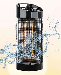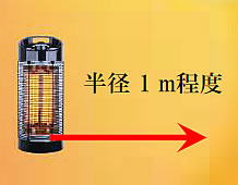 | ■特長 ●足元をしっかり暖める テラス席などの屋外において、どんなに暖房機を設置しても、足元を安全に暖めることができる 暖房機が今までありませんでした。 ここでお勧めの暖房機が足元用暖房機。足元をしっかり暖めます。 防水機能を持っているため、屋外で使用できることが最大の特長です。 また、防護網の部分は、触っても熱くない特殊植毛加工が施されています。 首振り機能や、転倒時自動OFF機能など、足元の暖房に特化したお求めやすい暖房機です。 ●防水 IP44の防水性能のため、安心して屋外でご利用頂けます。 イラストはイメージです。直接水をかけての水洗いなどは避けてください。 ![]() ●触れても熱くない 付近に燃えやすいものを置かないでください。 防護網に特殊植毛加工が施されており、触れても熱くなりません。 防護網の拡大写真細かい毛のような素材が植え付けられています。 ![]() ●360°首振り 360°の首振りができますので、複数のお客様を対象にできます。 120°への切替も可能です。 ![]() ●首振りさせることで、暖房の熱が同じ箇所に集中することなく、適度な暖房感を提供できます。 ![]() ●転倒で自動OFF 万一の転倒でも、自動OFF機能により安心してご利用頂けます。 元に戻すことで自動復旧しますので、取扱も簡単です。 ![]() ■使用例 ●屋外テラス席などに ●水を扱う作業場などに ●住宅のエクステリア・庭園などに ![]() ■寸法 ※ご注意事項 事前に暖房機の消費電⼒を確認し、ブレーカー容量などにご注意ください。 ![]() ■暖房範囲の目安 ![]() ■仕様