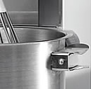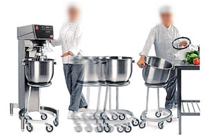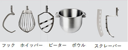 | ■特長 ●衛生的なステンレスボディ 本体表面にスクリュウが無く、クリーニングが簡単です。 バクテリアの繁殖を防ぎ衛生的です。 ●生地の自動掻き落とし プラネタリー撹拌と同時に生地を掻き落とす自動スクレバーを装備しています。 ●IP44防塵・防水 上記規格は、1mm以上の個体が侵入する隙間が無く、水の飛沫による影響を完全にシャットアウトします。 ●マグネット着脱安全ガード マグネット式でワンタッチで装着できます。 透明な強化樹脂製で、ミキシング中の状況確認が可能です。 ●メンテナンスフリー 内部はギア構造ではなく、グリスアップは不要です。 プーリーベルト駆動の為、耐久性に優れています。 ●勾配床でも水平に設置可能 4本の脚部はそれぞれ独立して高さ調整が可能です。 ■使いやすい操作パネル 人間工学に基づいた傾斜と高さに設計されています。 シンプルなデザインで8段階のスピード調整が可能です。 ![]() ■ステンレス製ツール ツールはステンレスで作られており、耐久性に優れています。 食器洗浄機にも対応し、衛生的です。 ![]() ■使いやすい昇降ハンドル 人間工学に基づいた、使いやすい昇降ハンドルです。 ボウルの停止位置まで下げるだけで、ロックがかかります。 ![]() ■マグネット着脱式 安全カバー 透明な強化樹脂性の完全カバーが付属します。 脱着にボルトなどを使用せず、非常に衛生的です。 動作中の材料の飛散を防止し、ミキシングの状態を確認することができます。 ![]() ■使用例 ![]() ■タイプ
